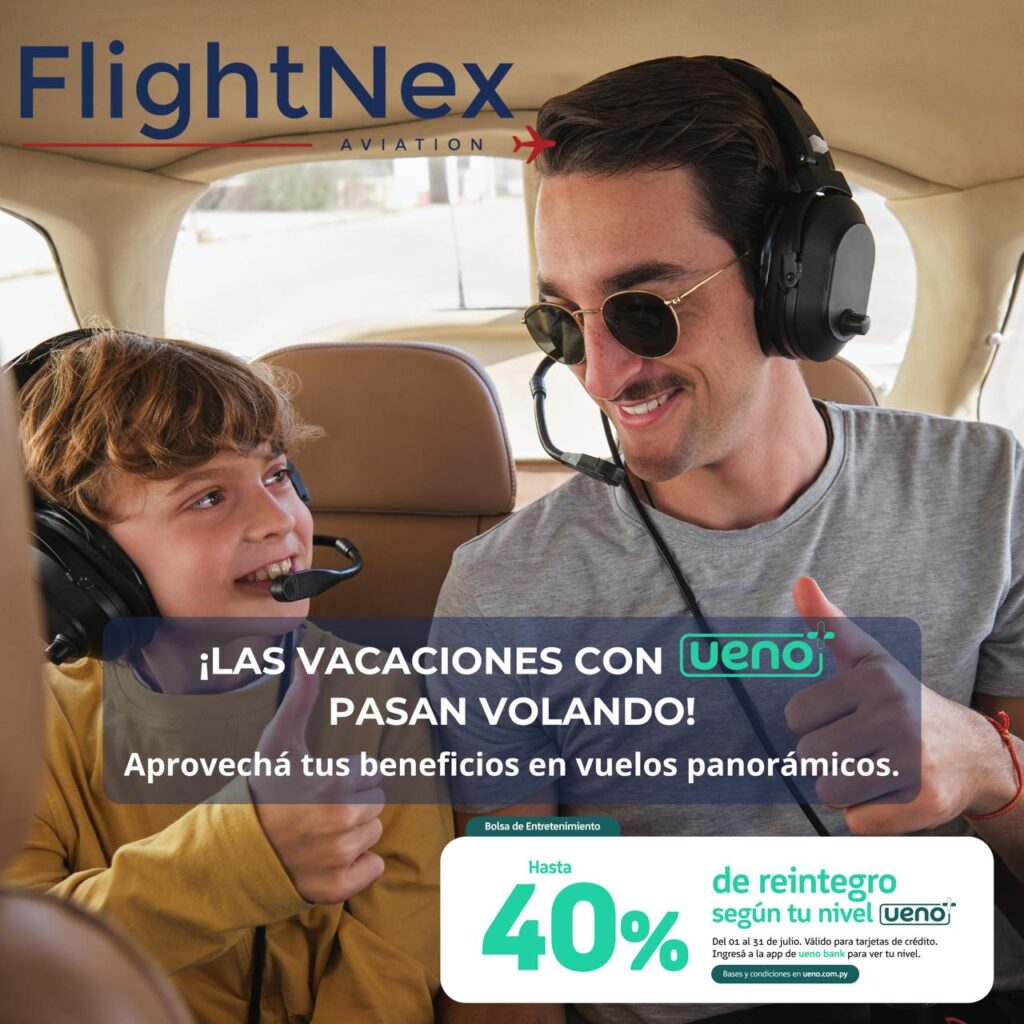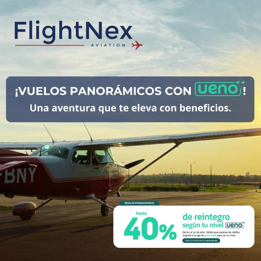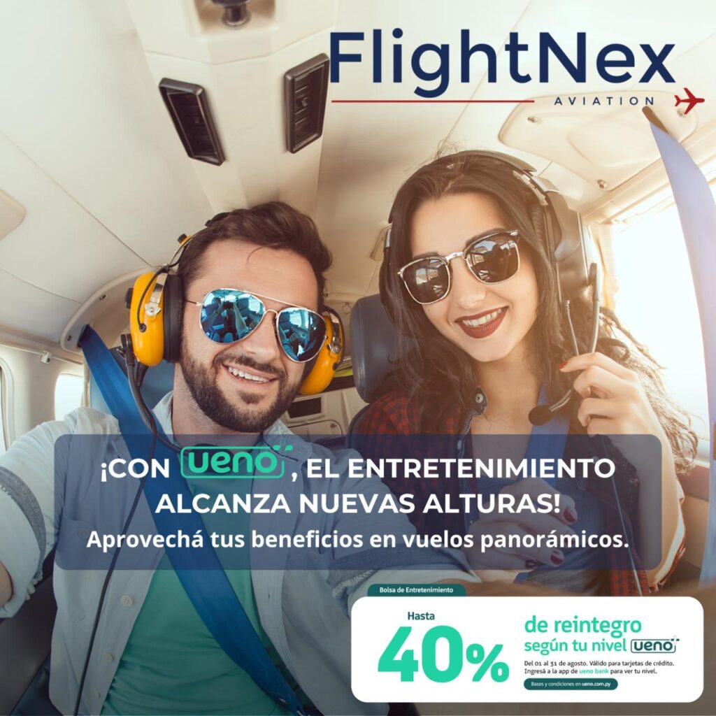 Gracias a la alianza entre FlightNex Aviation y UENO Bank, nuestros pasajeros acceden a beneficios exclusivos que transforman cada vuelo en una experiencia aún más gratificante.